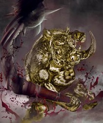 Ce que l'on remarque en premier quand l'on voit Tihre Lirre, c'est qu'il est fait d'or. Non, non, il n'est pas « juste » recouvert d'une armure en or, il est en or ! Techniquement, seulement sa peau est de ce métal des plus précieux. Mais il faudrait l’approcher pour pouvoir vérifier, or, ses deux énormes défenses sortant de sa bouche porcine ne donnent pas trop envie de s'y frotter. Le fléau d'arme qu'il tient d'une main de fer complète le tableau et pousse à maintenir un écart de survie relativement important.