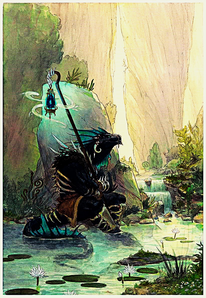 Mon visage est effilé, mon museau allongé et puissant. Mes yeux jaunes, aux pupilles fendues, observent sans relâche. Tss. Quelques crocs dépassent légèrement de ma gueule, rappel muet de ma nature prédatrice. Mes mains sont longues, puissantes, terminées par des griffes épaissies. Elles savent tracer les glyphes, manier les outils rituels, mais aussi accomplir les sacrifices. Dans l’une, je tiens mon bâton, canal de la magie céleste. Dans l’autre, ma lame de Sotek, toujours prête à remplir le rôle que les Anciens ont prévu pour moi. Ssshhht.