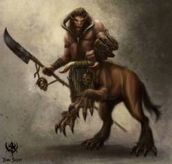 Les Centigors sont des hybrides inquiètants de créatures quadrupèdes, telles que des chevaux ou des taureaux,et de bêtes bipèdes, réunies par les énergies du Chaos. Le bas de leur corps est celui de leurs ancêtre quadrupède, qui qui leur garantit un force et une vitesse considérable, mais le haut est humanoïde et leur permet de manier des armes.