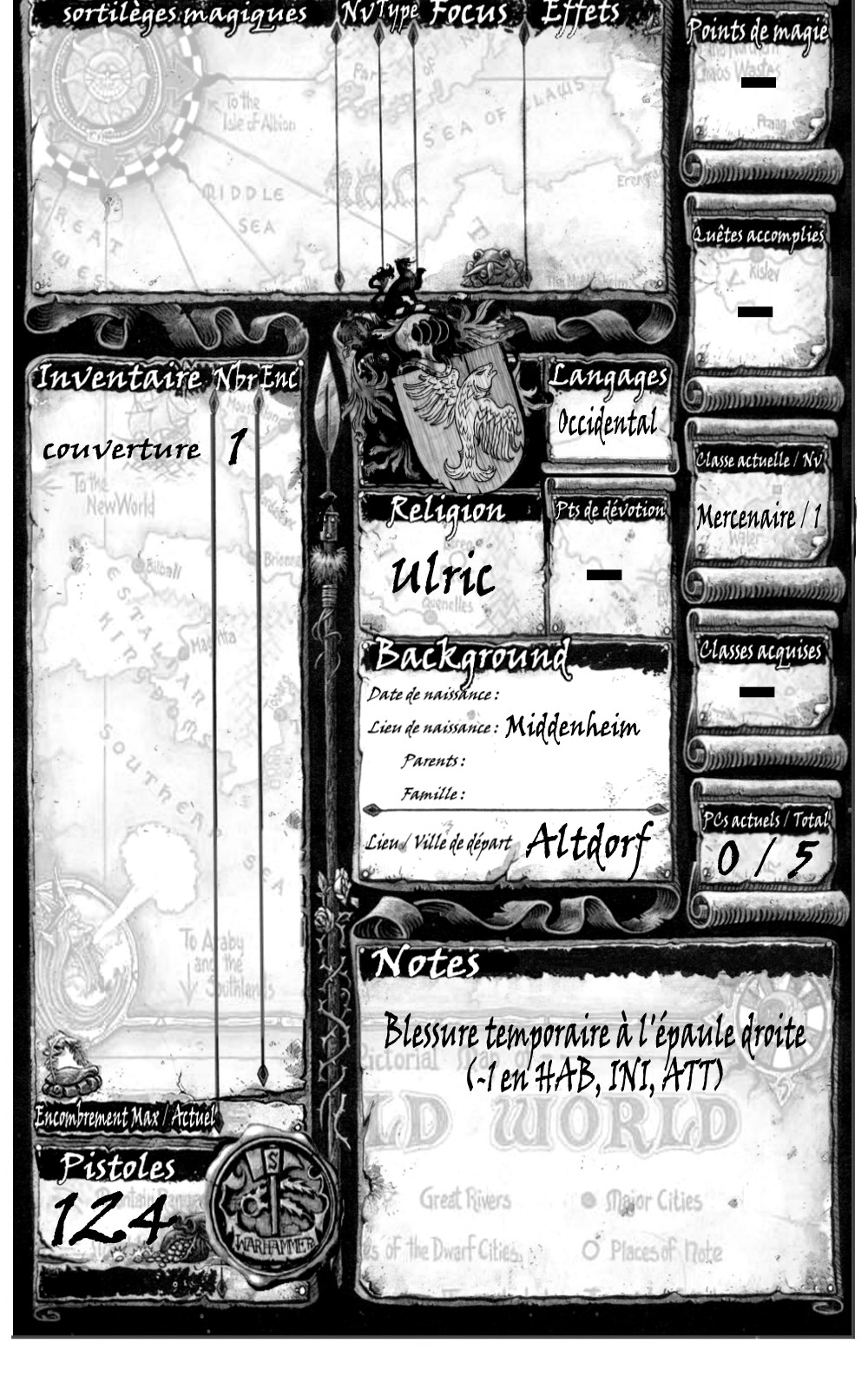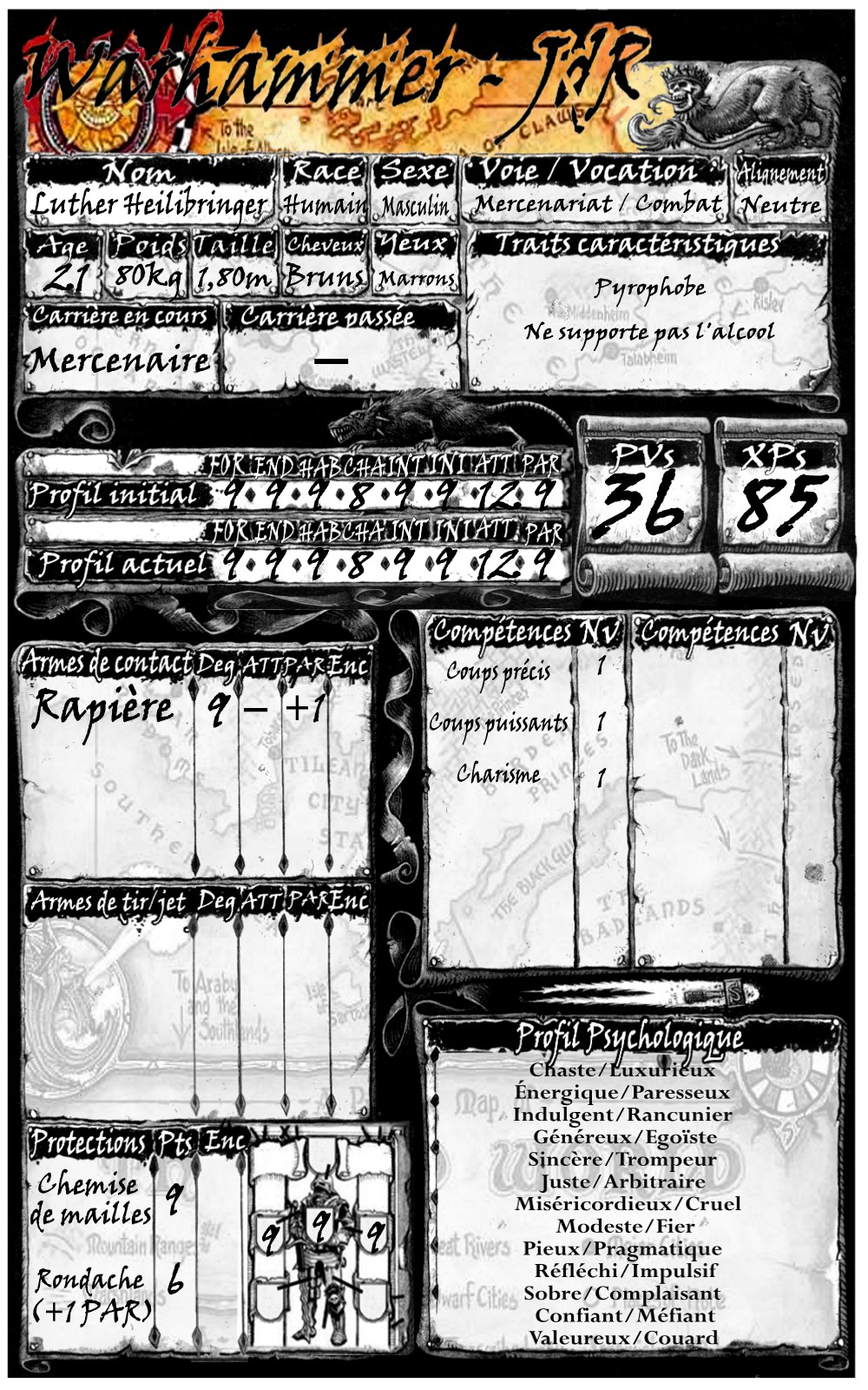 Enfin , fermant la marche , le lieutenant Ingar Röchter , lui aussi monté sur un destrier revêtis de la reconnaissable peau de panthère des chevaliers panthères de Middenheim , dirigeait le reste des mercenaires provenant de diverses horizons du vieux monde : Bretonnie , l'Empire , les principautés frontalières...soit un contingent militaire d'une cinquantaine d'hommes . Luther faisait parti de ceux-là.